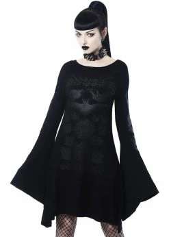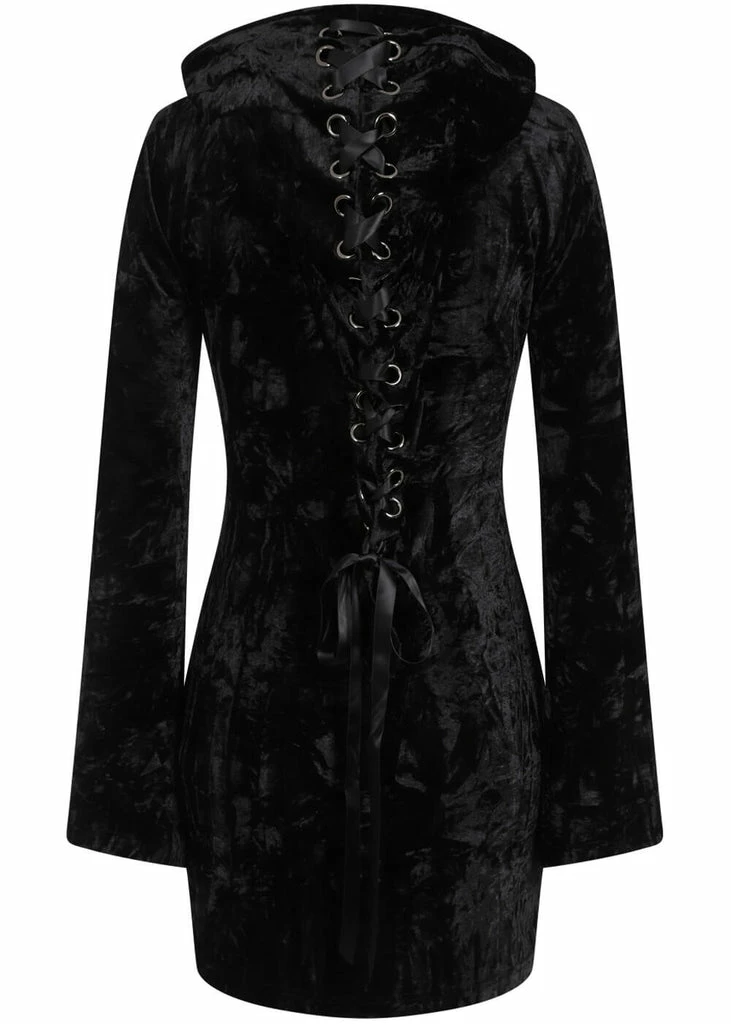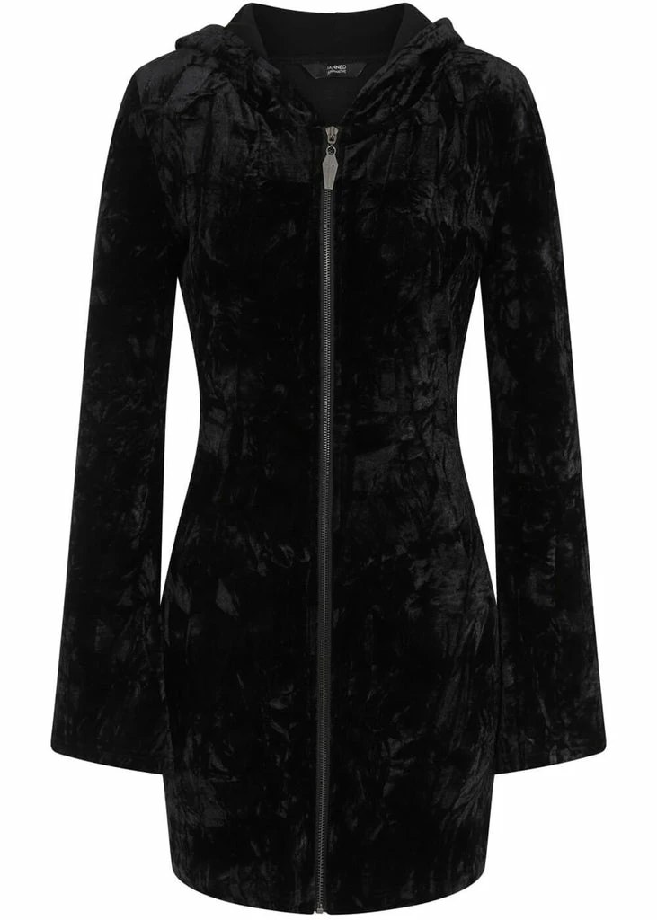 We’ve got a Big Crush on this soft cutie, with her big pointy hood that is adorned with a satin lacing in the back! The long sleeves flare slightly and she’s made of soft velvet with stretch that is delicate to wear. She closes with a zipper all over the front, decorated with a coffin. For a height of 1,70m she ends far above the knees, a real 60’s length.