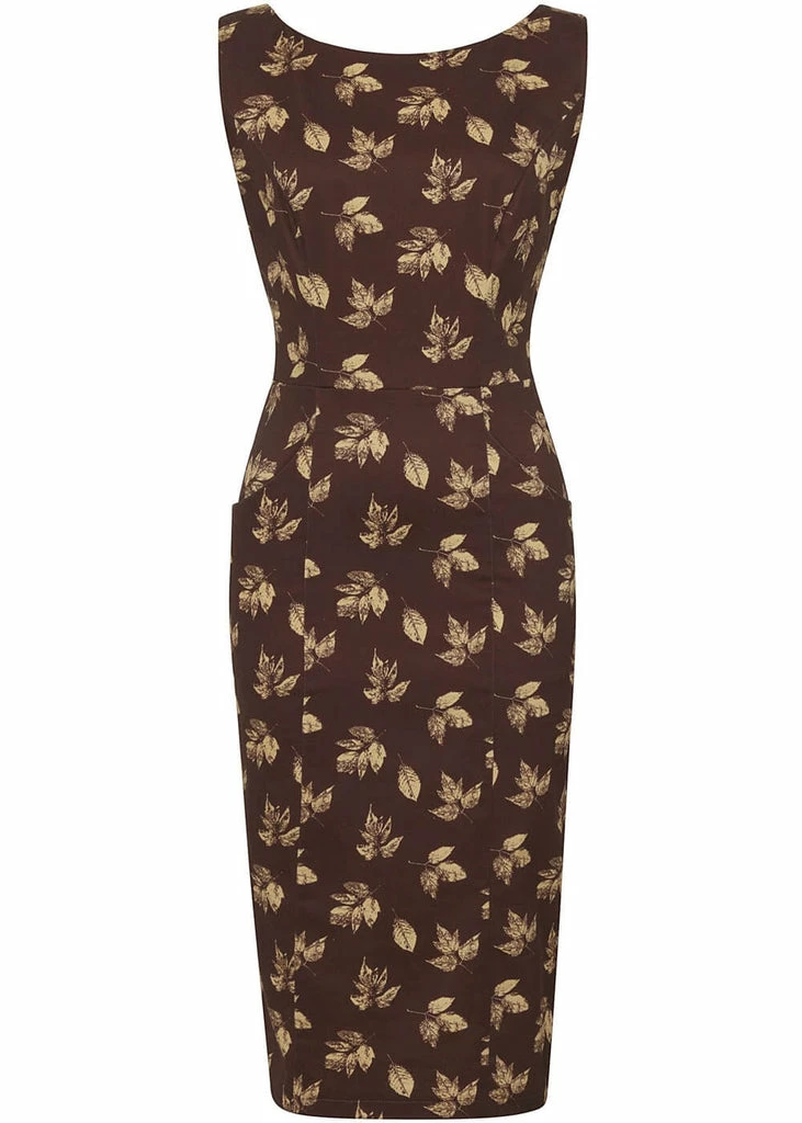 Collectif Hepburn Fall Leaves 50’s Pencil Dress Brown