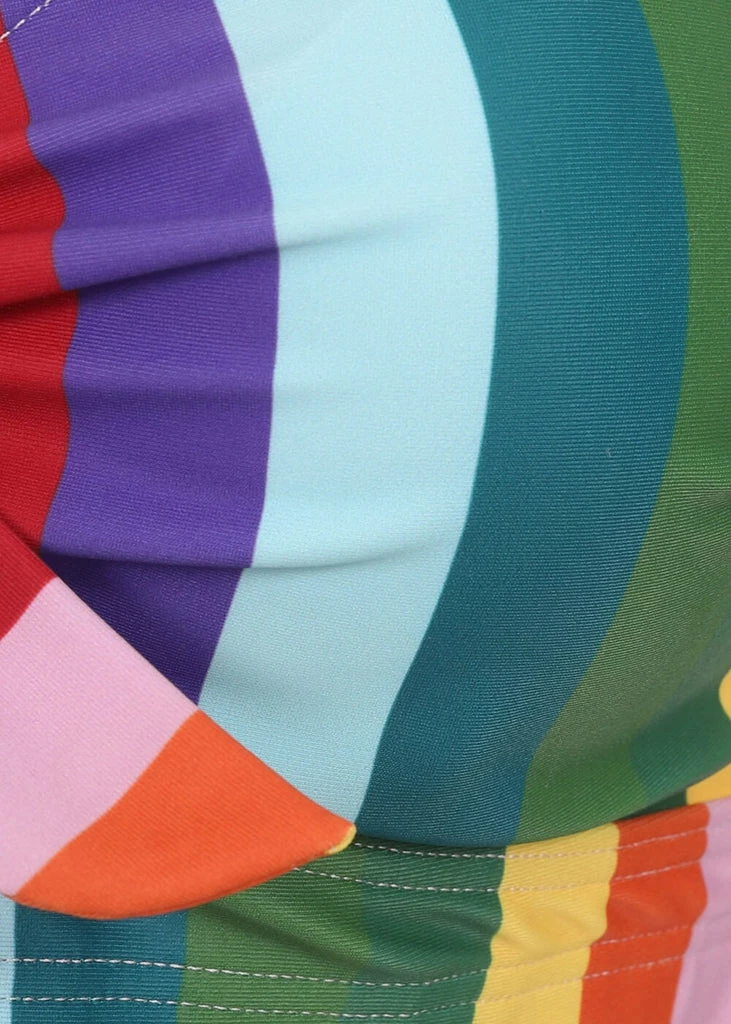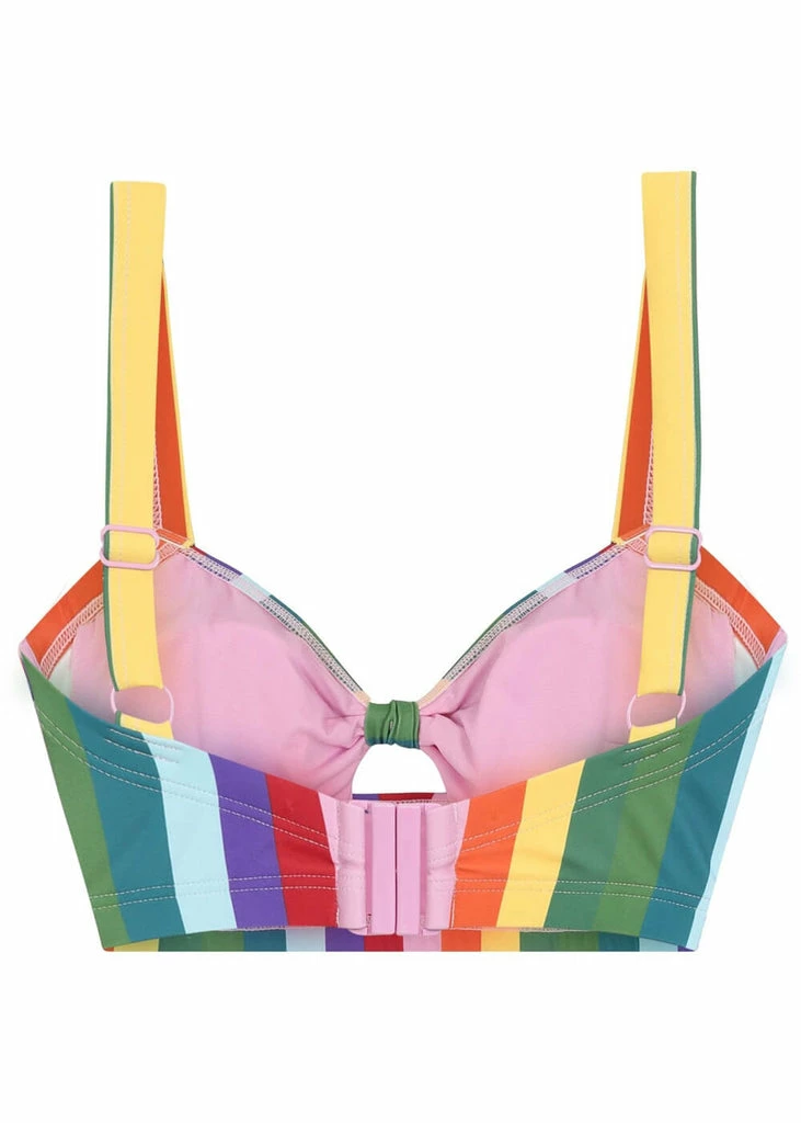This beauty has removable padded cups, a front which you can tie and adjustable straps for that perfect Pin Up look. She closes with a bikini clip on the back. Size wise this bikini top fits true to size, if you’re in between sizes we suggest sizing up, the stretch is accounted for in the sizing chart.