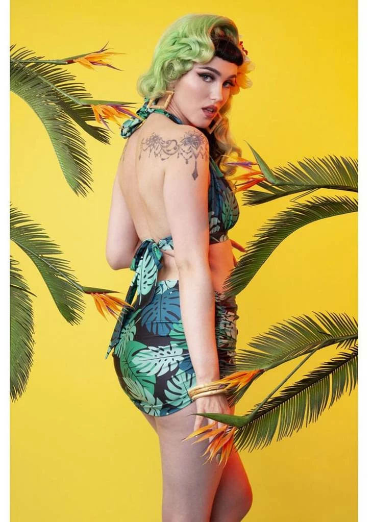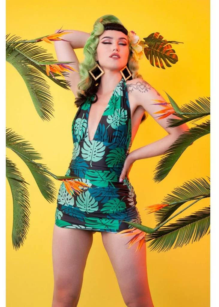 These vintage inspired swimsuits are super comfortable thanks to their lovely amount of stretch. With her cheerful palm leaves, you instantly get that summery feeling! This bathingsuit has a deep cleavage and a seducing Pin-Up look. The cups aren’t wired or strengthened. The halter can be tied in the neck.