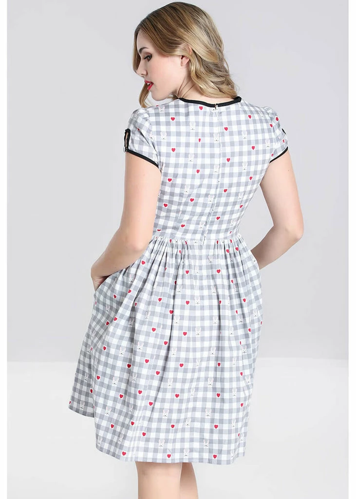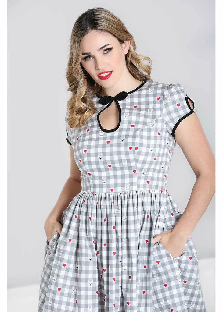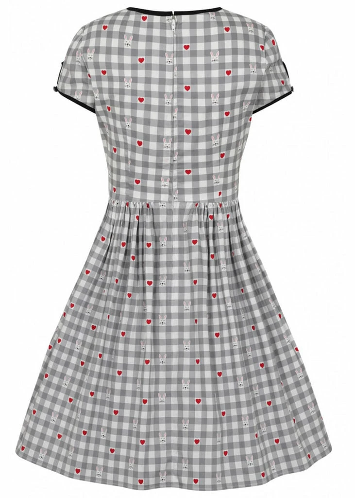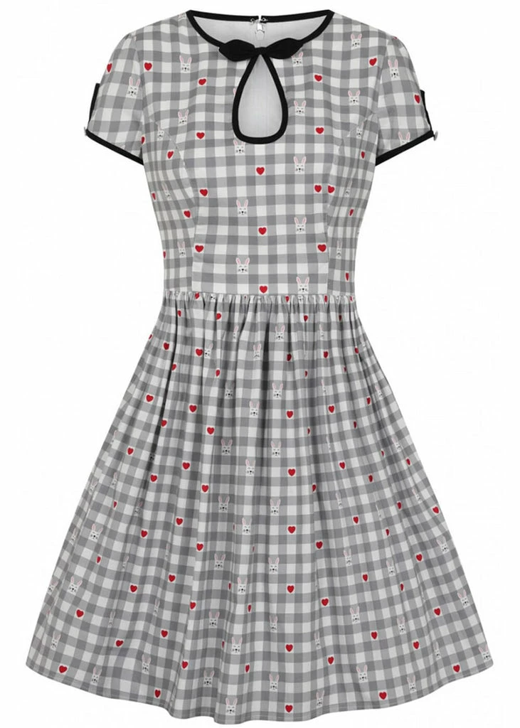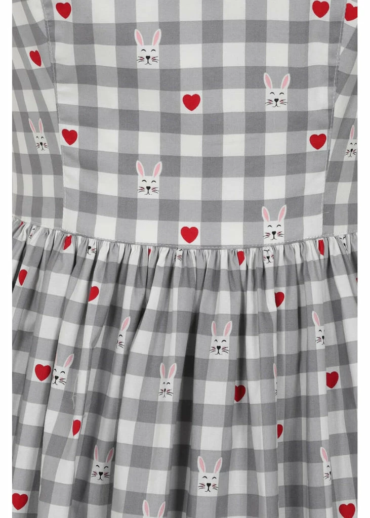 Between the grey and white gingham, the bunnies are watching happily, because the details are just adorable: for example the playful keyhole in the neckline, that is adorned witha little bow and black piping, just like the short sleeves, whose keyholes close with little buttons.