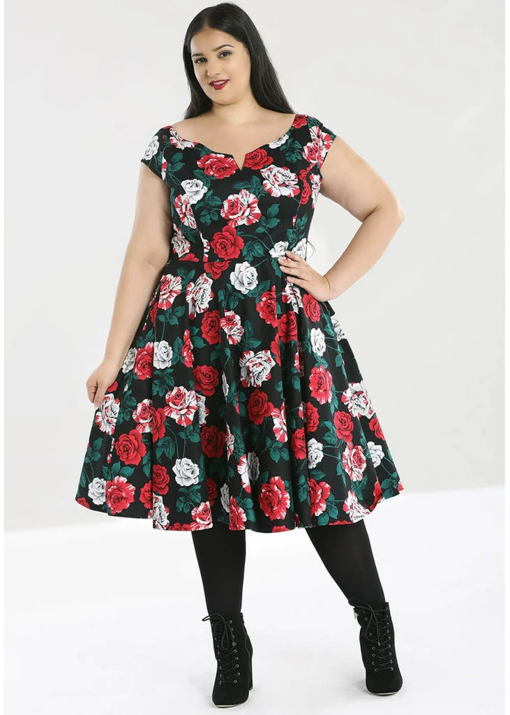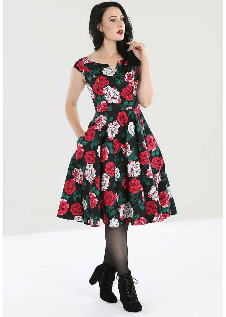Ruby is made of a high quality cotton mix with slight stretch that makes her feel as great as she looks. From the waist, she flares into a full skirt with pockets, that you can beautifully combine with one of our petticoats to make the print come alive. She closes with a zipper in the back and ends around the knees for a height of 1,70m.