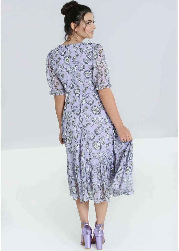 There are seams emerging from the v-neck, which run underneath or across the chest, for the classic vintage look. The halflong sleeves are semi-transparent and slightly puffy thanks to the gatherings at the shoulders and the fine elastic. The waist is adorned with decorative buttons, before she flares into a full skirt with a ruffled edge, that ends below the knees for a height of 1,70m.