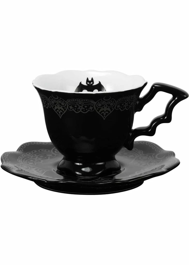 After Midnight adds a dark tint to your cup of coffee, tea or (also incredibly dark) hot cocoa! The handle has the shape of a bat wing, which can be seen again inside of the cup. The outside and the saucer are decorated with rich patterns, making you decadently point one pinky out while drinking 😉