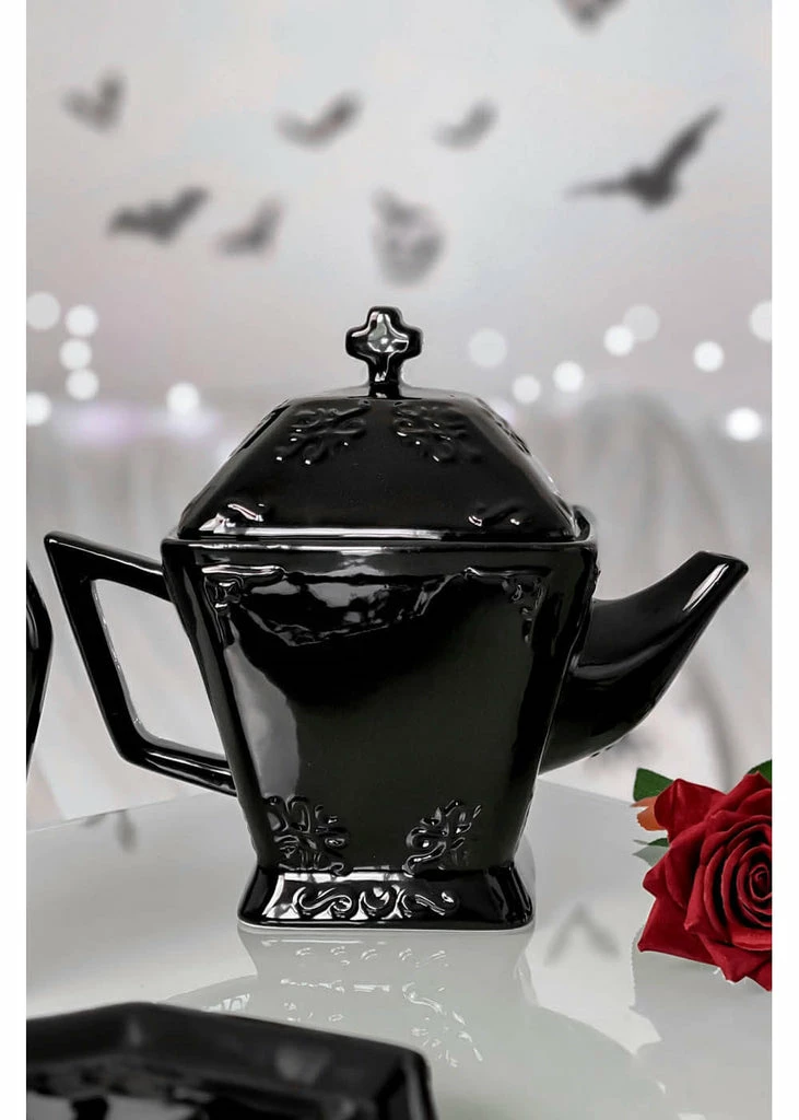 This coffin-shaped teapot adds a dark tint to your cup of coffee, tea or (also incredibly dark) hot cocoa! The lid is decorated with a cross and thanks to the glossy ceramic, it seems to open any second…