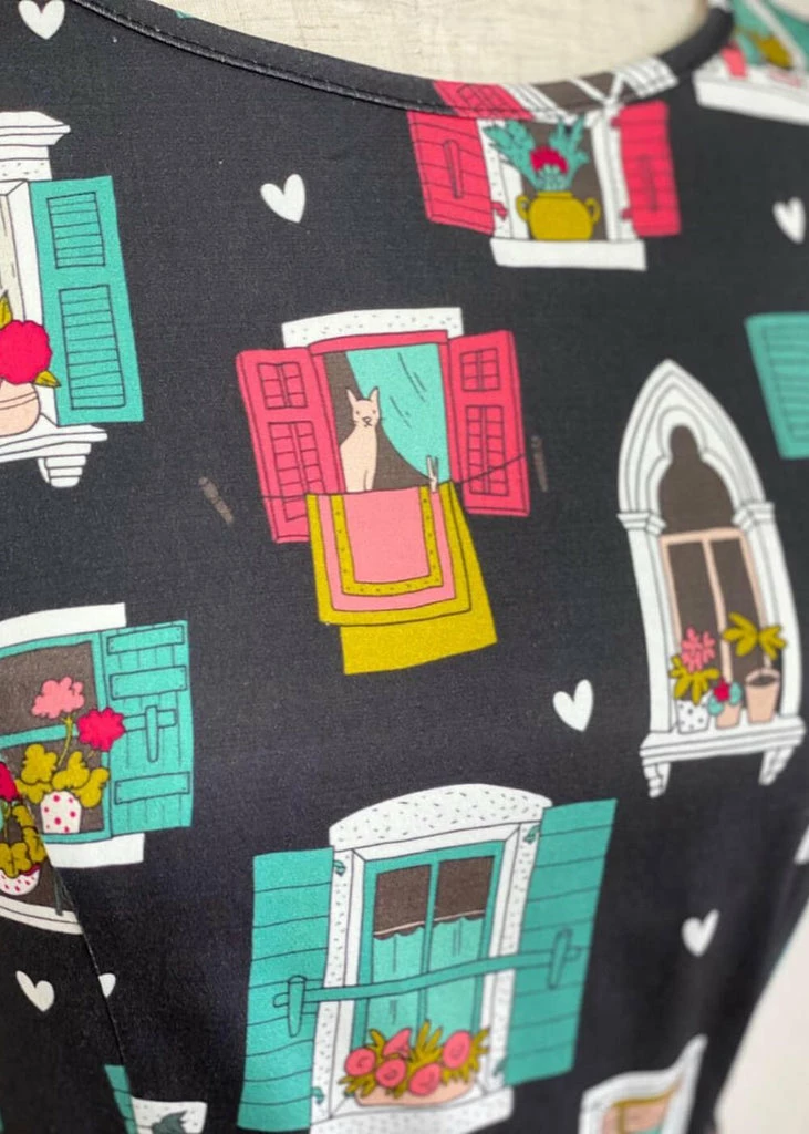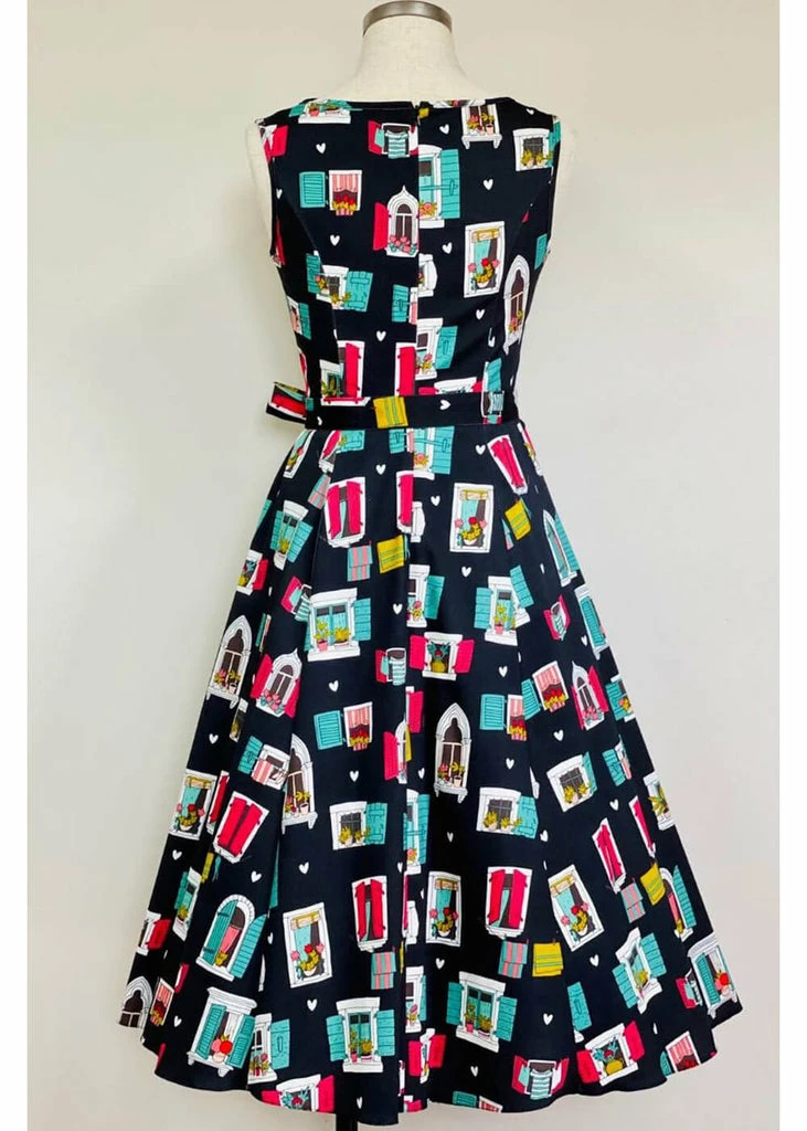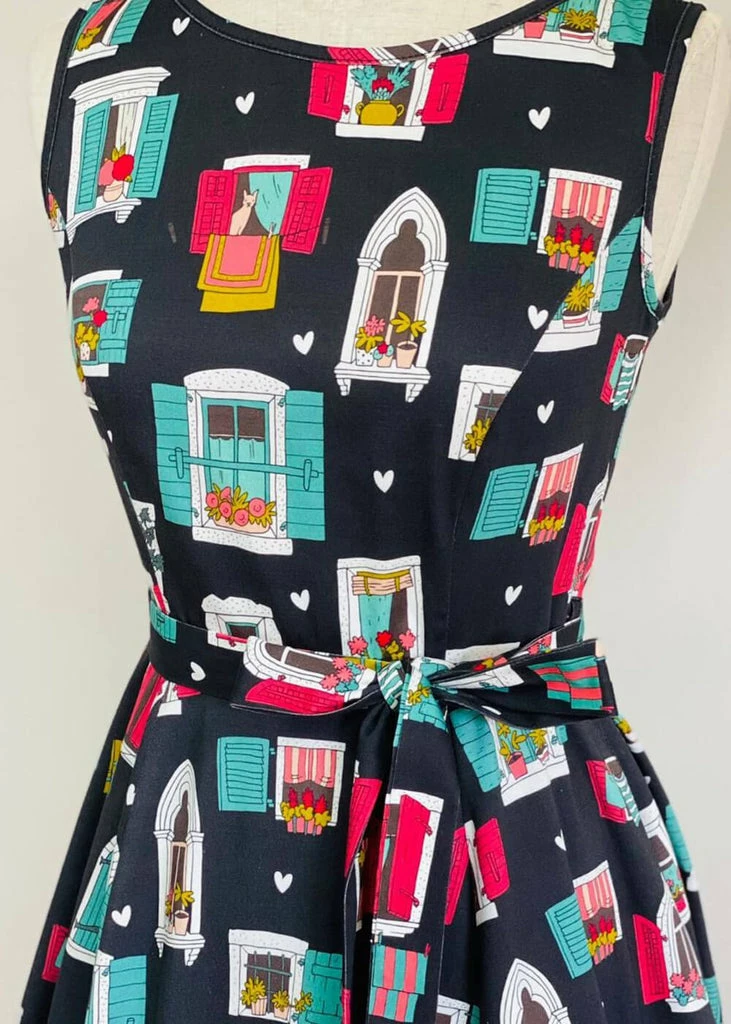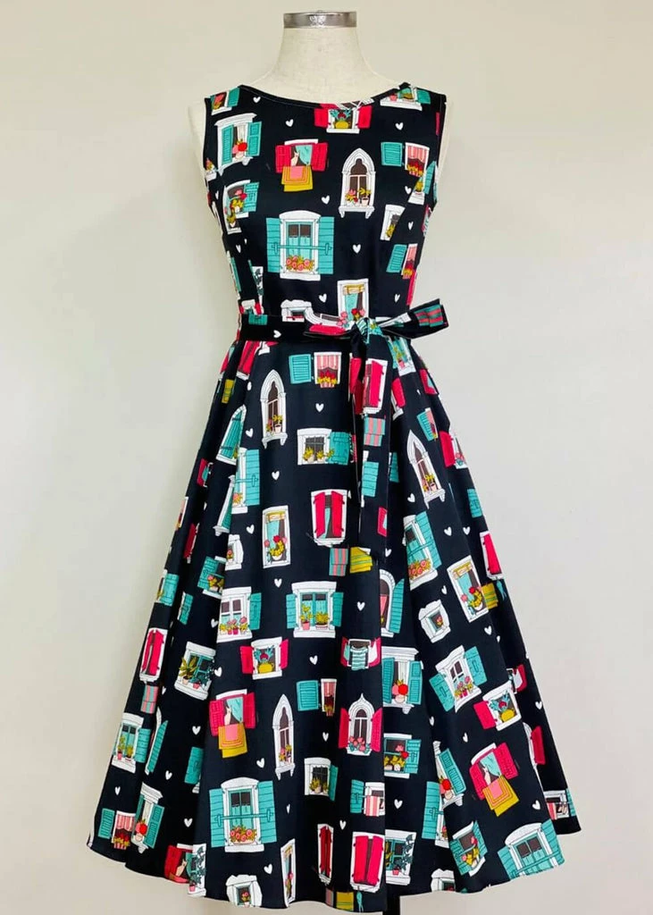 Inspired by our style icon Audrey Hepburn this beauty has a high neck and back, with princess seams to ensure an elegant fit and she feels lovely to wear thanks to her cotton-mix with a slight stretch. The waist is accentuated by the non-detachable sash, down from which she flares out into a playful swing-skirt.