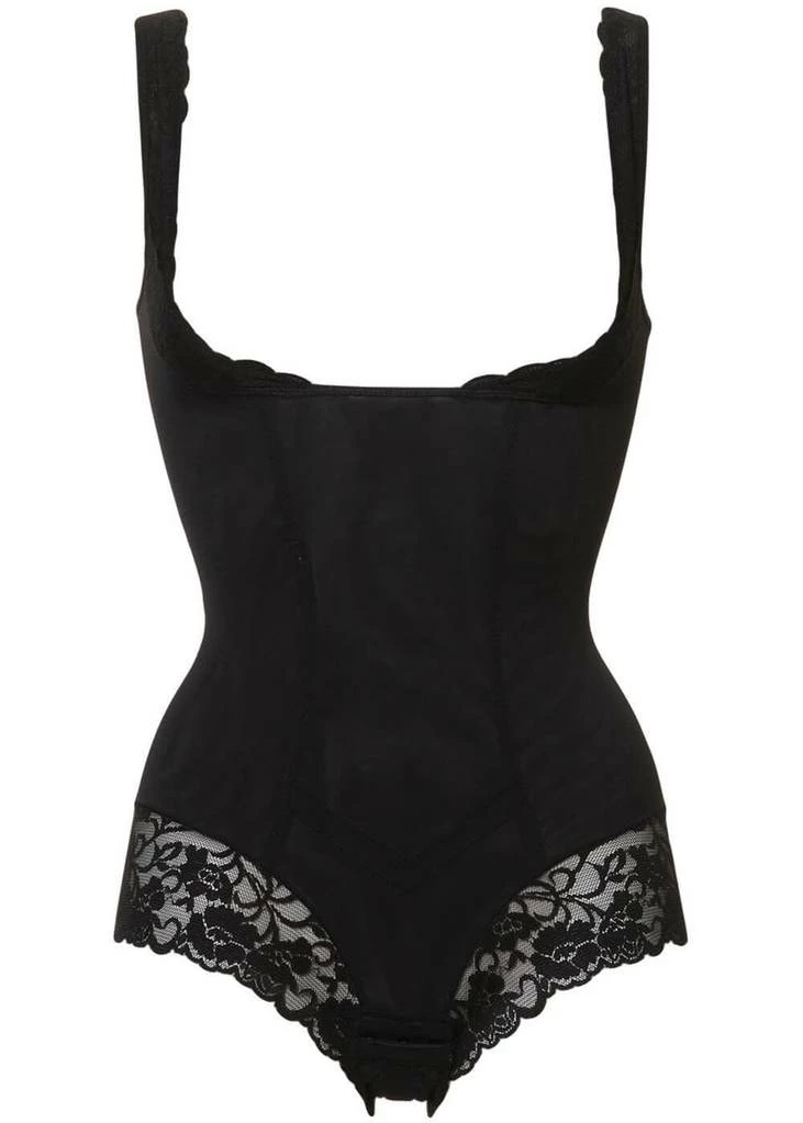 The Super Control Body is not only perfect for a great correction of your whole upper body, but also very charming with the lace details! It has a double layer of mesh in the front and on the upper back, for that nice correction. The body runs underneath your own bra to create a slight push-up effect. The crotch is made of cotton and closes with hooks and eyes.