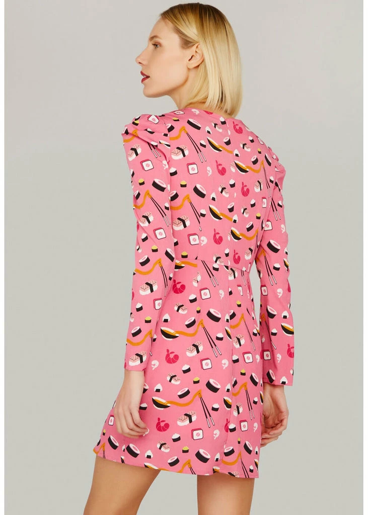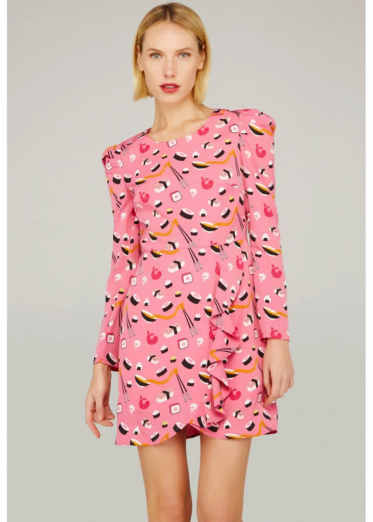 Have your favourite food always closeby with the Maki dress, even the waterfall ruffle on the skirt is covered with it! It seems like you could eat the sushi straight from the smooth pink fabric without stretch, but we definitely recommend wearing it 😉