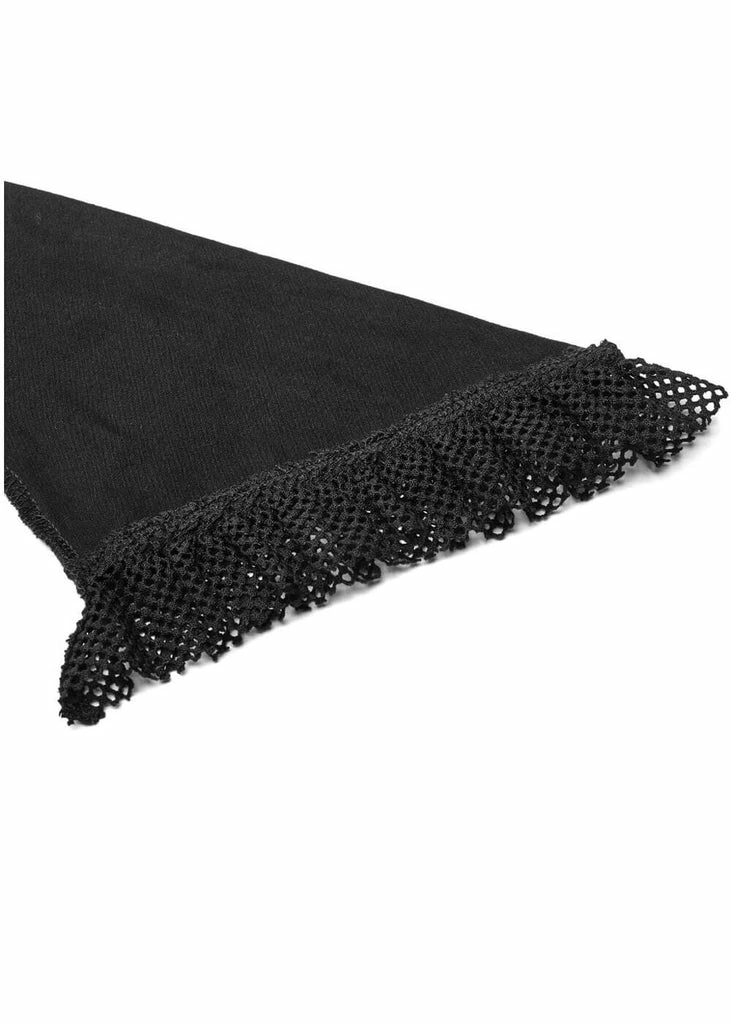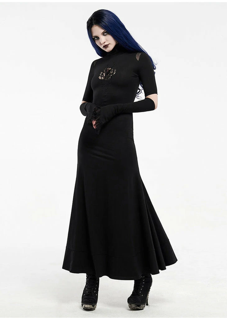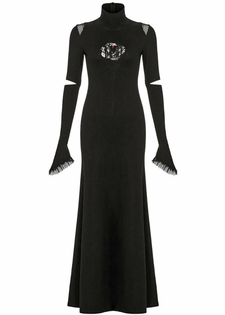 Minverva is super-vampy with her lace rose and gemstone detail, that looks like a spider… The model is oh so enticing with her open sleeves with mesh, that also returns at the shoulders. This treasure is made of a jersey-cotton-mix with slight stretch, so she fits Vavavoom until the hips before flaring into a subtle fishtail. She closes with a zipper in the back of the high neck and falls to the ground for a height of 1,75 m.