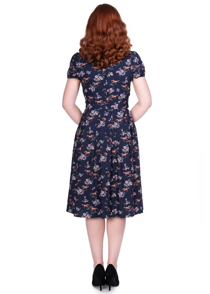 The waist is accentuated by a sash, down from which she flares out into a playful skirt with pockets. She’s perfect for combining with one of our petticoats to make that bouquet come to life, but she’s stunning without as well. With a height of 1,70 she reaches down to the knee and closes with a zipper on the back.