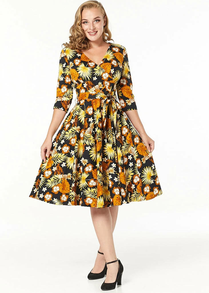 With her stunning flowers in all shades of brown and (mustard)yellow on a black background and her half sleeves, she’s everything we could wish for. She has an overlap on the chest and small pleats above the waistband for a classic 50’s look. MAde of a fine cotton-mix with slight stretch, she is so comfortable that she’ll never be in the closet for long 😉