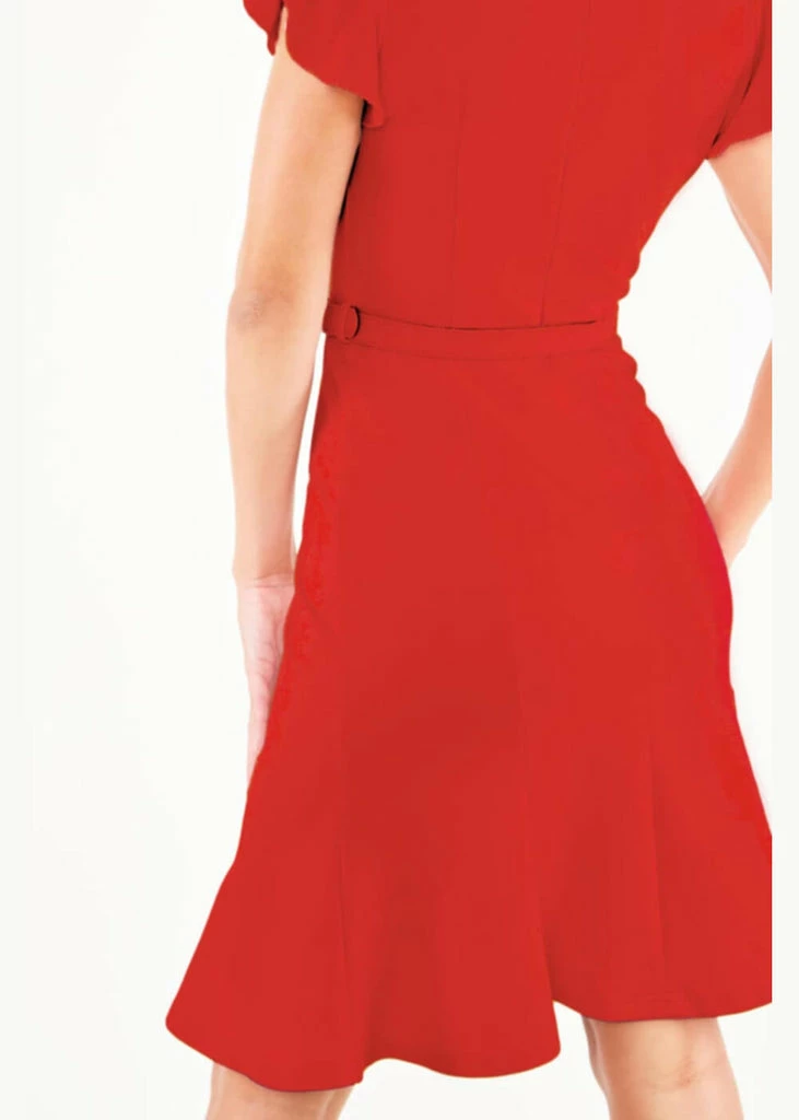 The waist is accentuated with the removable belt, from where she flares slightly at first, and a little more towards the bottom seam. She closes with a zipper in the back and for a height of 1.70 m, she ends around the knees or just below.